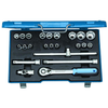 With forged, tempered hexagon (no.19) or UD profile sockets (no. D 19), hand-operated. With accessories made from Gedore vanadium steel 31CrV3. Set U-20 with robust lever-change reversible ratchet, with push-button release. Set U-3 with fine toothed, dial change ratchet. In Gedore blue sheet steel case. Dimensions: 425 x 277 x 55 mm.
