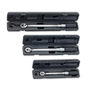 Chrome-Vanadium in plastic box. Lever type reversible ratchet with quick release ejector button. Clearly visible scale. Locking of set torque. Nonskid turning handle for safe handling and precise adjustment of torque value.