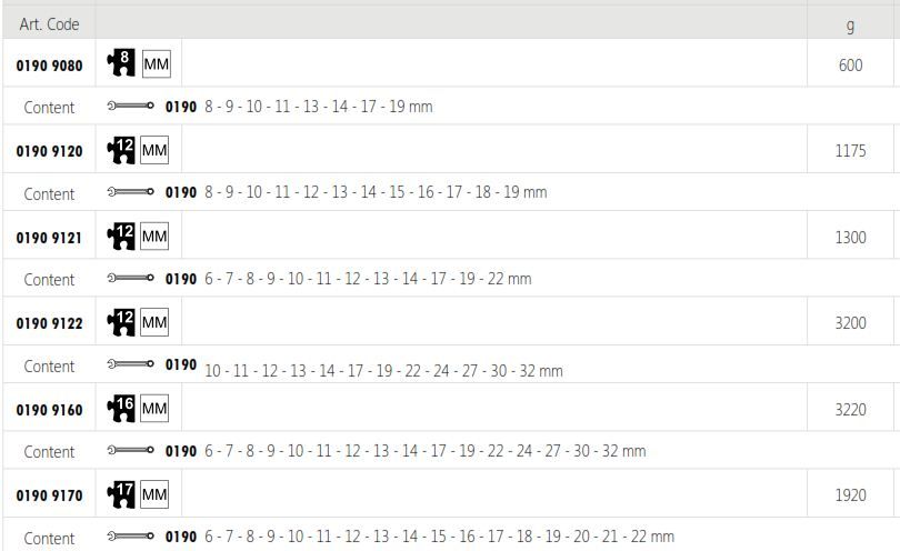 – Sets in practical, transparent polypropylene box (except for 0190 9122 / 9160 / 9161 =carton box)