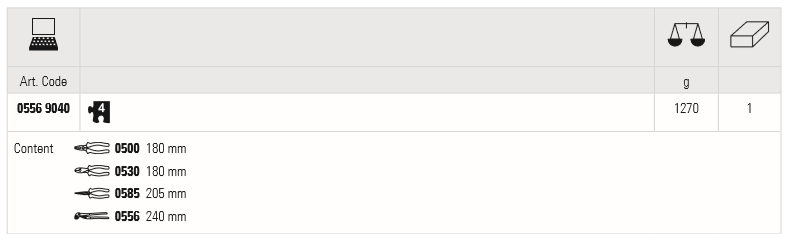 – Pliers Assortment, in practical, transparent polypropylene box: robust packaging, stackable and easy to stock, reclosable, reusable and with hanging hole for tools panels