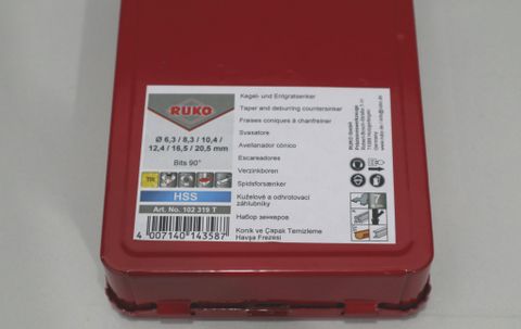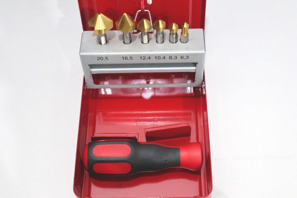 7-piece set of taper and deburring countersinker bits 90° 6 taper and deburring countersinker bits Ø 6,3 - 8,3 - 10,4 - 12,4 - 16,5 - 20,5 mm + 1 universal handle with ¼" hexagon socket